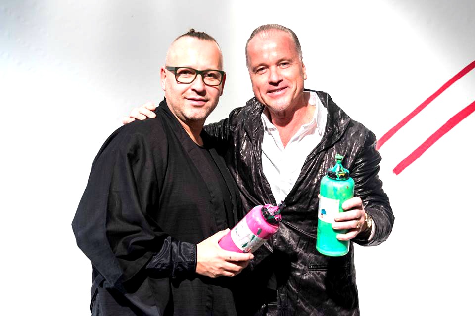 Live-Performance im Atelier in der Apostelgasse im dritten Wiener Gemeindebezirk. Mario Dalpra, Künstler, Skulpturist, Maler und Aktionist mit Juergen Christian Hoerl, Modeschöpfer, Fotograf, Kostümbildner und Textilkünstler.